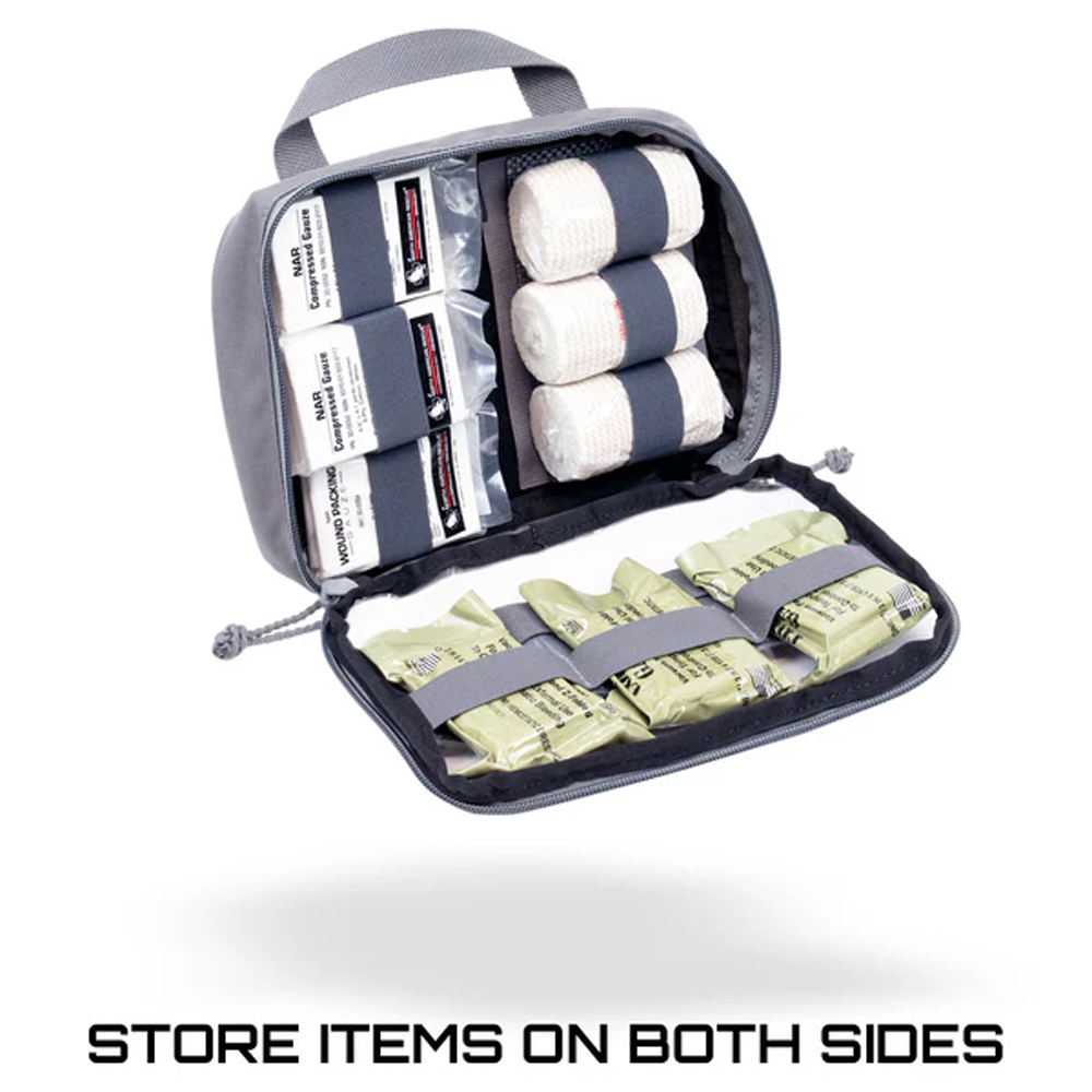 Designen kombinerar två viktiga funktioner: visuell överblick och strukturerad organisering. Framsidan har ett transparent vinylfönster som gör det enkelt att snabbt identifiera innehållet – särskilt användbart vid arbete i team eller masskadehändelser. Samtidigt finns elastiska organiseringsband bakom fönstret för att hålla utrustningen på plats.