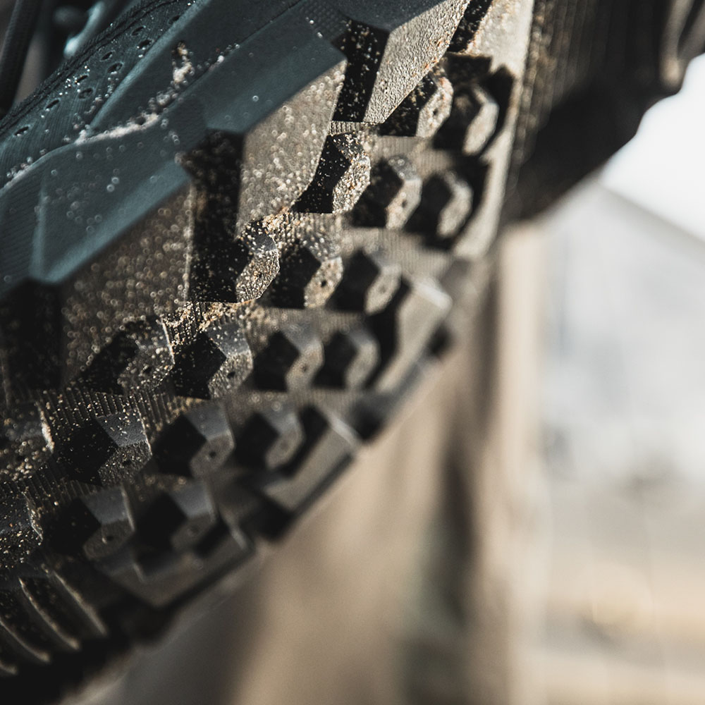 Kompressionsgjuten mellansula och grovt mönstrad yttersula med bra dämpning.